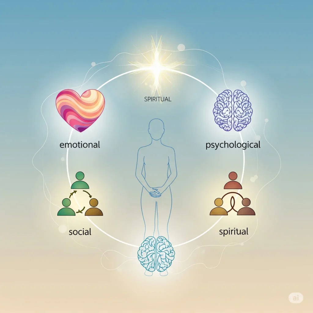 سلامت معنوی، حسی از آرامش درونی و رضایت است که از هماهنگی بین باورها، ارزش‌ها و اعمال ما ناشی می‌شود. این بعد شامل مؤلفه‌هایی مانند داشتن هدف در زندگی، احساس تعلق به چیزی فراتر از خود، و داشتن یک سیستم اعتقادی است که به ما در تفسیر تجربیات زندگی کمک می‌کند. سلامت معنوی به ما کمک می‌کند تا با چالش‌های وجودی مانند رنج، فقدان و مرگ روبرو شویم و در آن‌ها معنایی بیابیم. این بعد در فرهنگ‌های مختلف به شیوه‌های متفاوتی تعریف و تجربه می‌شود ، اما هسته مشترک همه آن‌ها، جستجوی انسجام و معناست. فردی که از سلامت معنوی برخوردار است، احساس نمی‌کند که در یک جهان تصادفی و پوچ سرگردان است؛ بلکه حس می‌کند زندگی‌اش دارای جهت و ارزشی ذاتی است.